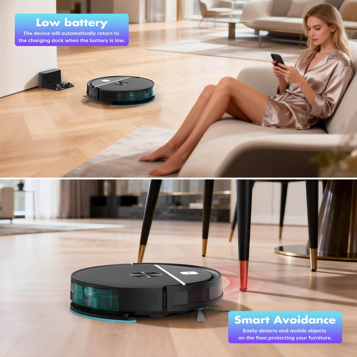 I’ve been using this robot vacuum and mop combo for a little while, and it fits well into my cleaning routine. The size is compact, so it slides under my low TV stand and sofa without getting stuck. I mainly use it on hard floors, and the suction has been enough to pick up dust and pet hair. The water tank is easy to fill, and the mop leaves a light, even wipe on the floor.I switch between modes depending on the day edge mode works well around my cabinets, and the zig zag path seems more thorough when I haven’t cleaned for a few days. I also tried the app and the remote; both are straightforward to use. When the battery runs low, it goes back to the base on its own, which saves me from keeping track of it.